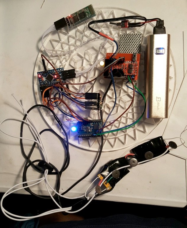 5 V power from USB battery to filter amp, Arduino and Bluetooth interface.